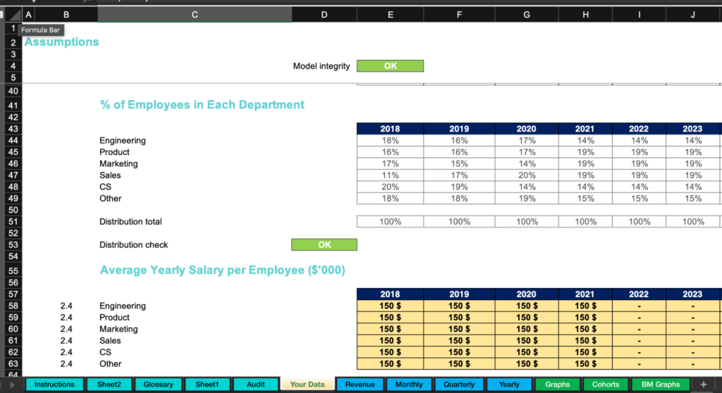 You now have a ready-to-use dashboard showing your key metrics over time (Graphs) as well as a cohort analysis report (Cohorts) and benchmark data to compare yourself against (BM Graphs). You can also use the Audit sheet to quickly find gaps in your model and find areas of concern.